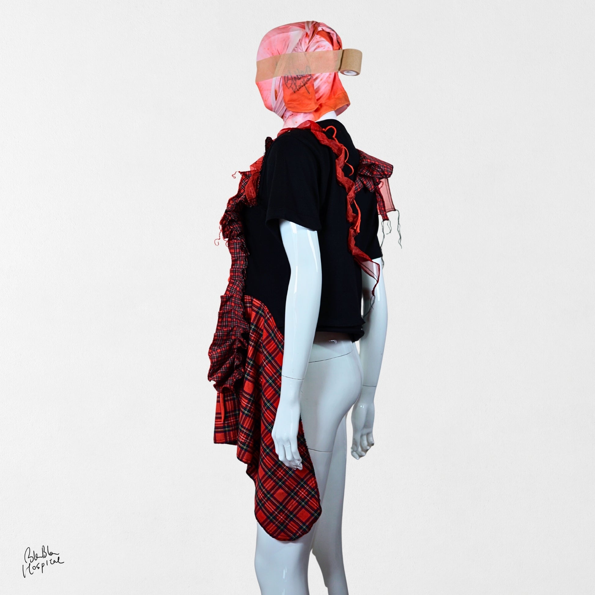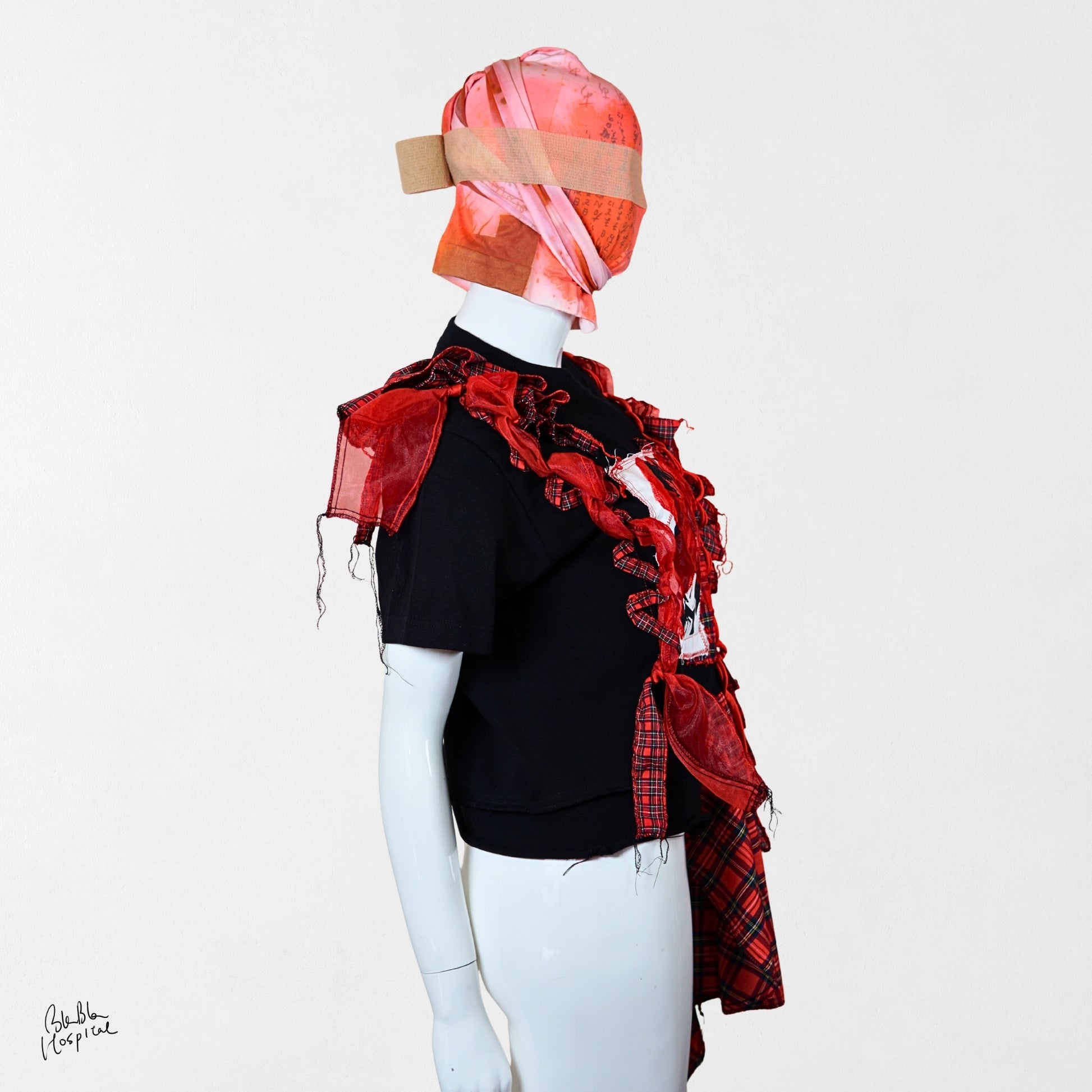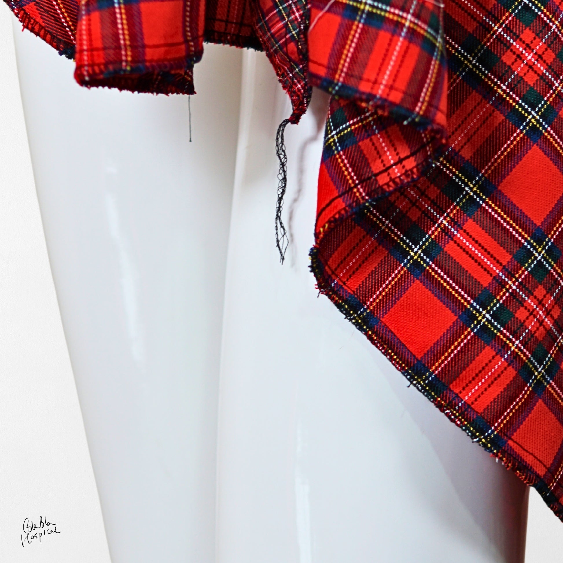 Face No.003 | Fabric Art Red Tartan Design – Black Scarf